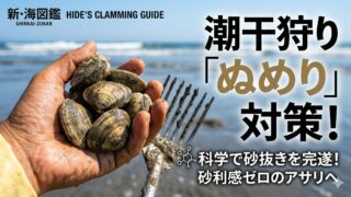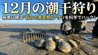 12月の潮干狩りはアサリが一年で最も旨い時期!なぜ12月に潮干狩りをするのか、その理由はグリコーゲン最大化の生化学にあります。水管が見えない冬の干潟でアサリを獲るための「砂の断熱効果」を利用したポイント特定術や、4mm厚クロロプレン等の最強装備をヒデが徹底解説します。