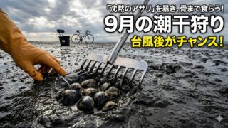 9月の潮干狩りはシーズンオフ?実は台風後の「寄りアサリ」を狙えば爆釣のチャンス!産卵後でデリケートなアサリの生態や、塩分低下による沈黙を読み解くガチ勢のテクニックを解説します。泥や漂流物から身を守る必須装備を整えて、潮干狩り9月の深い魅力をヒデと一緒に攻略しましょう!