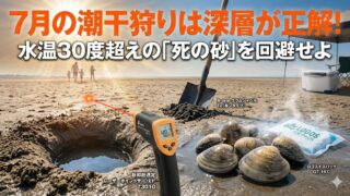 7月の潮干狩りで「死んだ貝ばかり」と嘆いていませんか?水温30度を超える7月の潮干狩りは、高水温と酸欠による死滅、さらに貝毒のリスクが急増します。51歳のプロが教える、熱砂の下にある冷たい深層を狙う攻略法と、鮮度を守る冷却化学で、安全でおいしい収穫を確実に手に入れましょう!