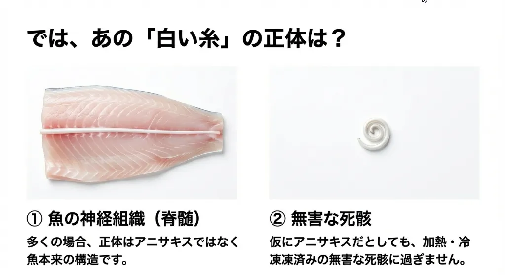 魚の背骨の中には、脳からの指令を伝える大事な神経が通っています。これが加熱されると白く固まり、箸で身を外した時にスルスルと引き出されることがあるんですね。見た目は確かにアニサキスに似ていますが、全くの別物です。
