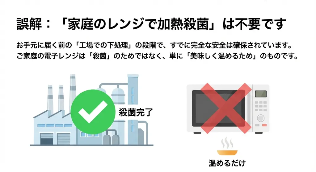 工場のオーブンは、家庭のレンジとは比較にならないほど強力で安定した熱を伝えます。厚生労働省が定める「中心温度60℃以上」という基準を確実にクリアした状態でパッキングされていますので、温め時間がたとえ数秒短かったとしても、安全性が揺らぐことはありませんよ。