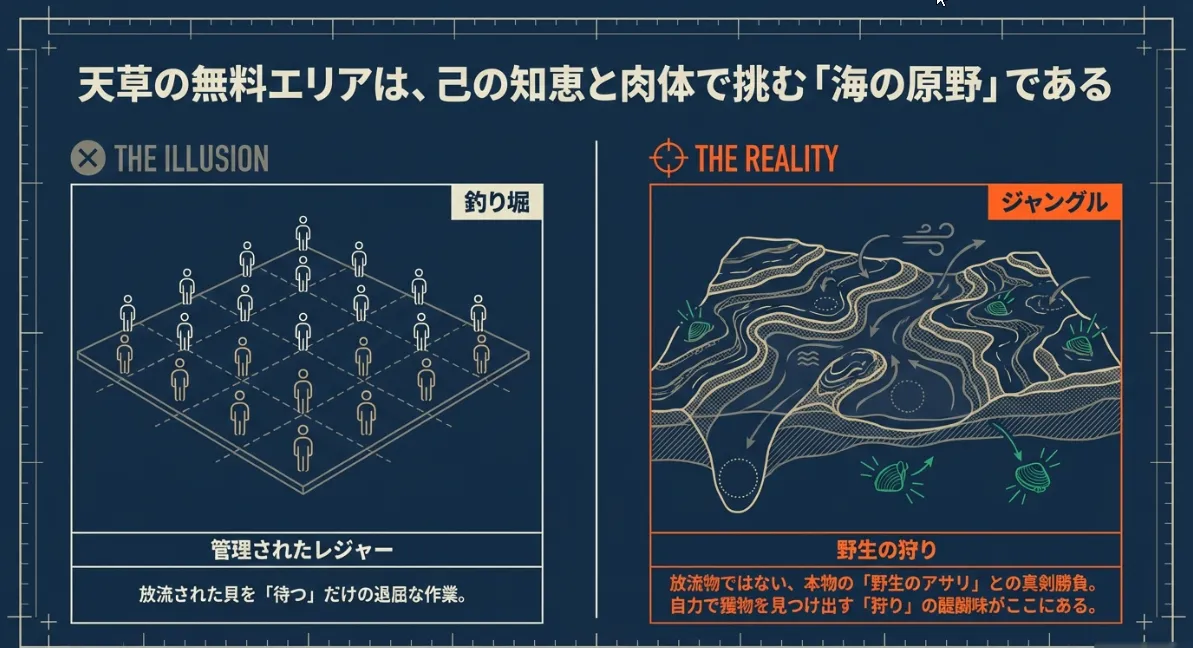 天草の無料エリアは「宝探し」の真剣勝負です。地形が生む酸素の供給量や、砂の中の化学変化を五感で読み解くことで、放流物にはない極上の野生個体に出会えます。