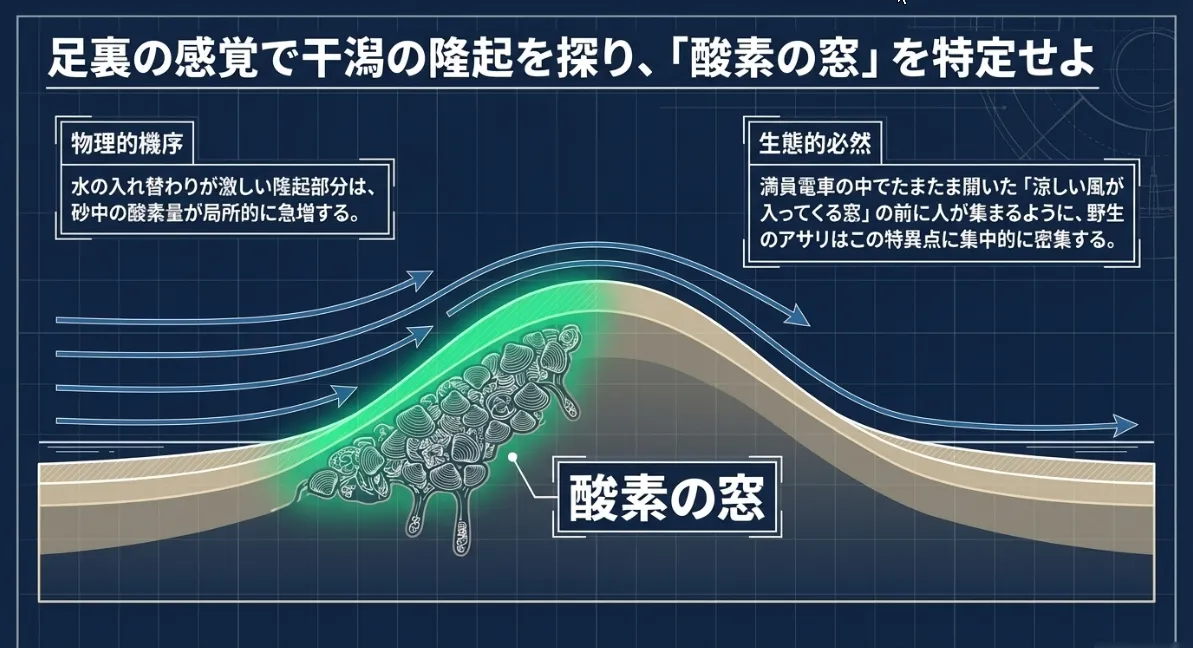 干潟をよく見ると、わずかに数センチだけ盛り上がっている場所があります。ここは水流が少し速くなるため、砂の粒が大きくなり、水の入れ替わり(酸素供給)が激しくなります。これを「酸素の窓」と呼びます。野生のアサリはこの「窓」の周辺に集中的に集まります。足の裏で砂の感触が少し「硬いな」「ジャリッとするな」と感じたら、そこが勝負ポイントです。