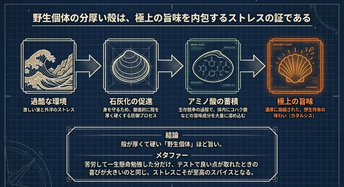 無料スポットのアサリは、すべて海流に乗って運ばれてきた幼生が、自分の力で着底し、過酷な生存競争を勝ち抜いた精鋭たちです。外部からの栄養供給がないため、彼らは限られたエネルギーを「生き残るための鎧」に変えます。それが、指で弾いても割れないほどの重厚な殻と、噛み締めるほどに溢れ出す濃厚な旨味の正体です。