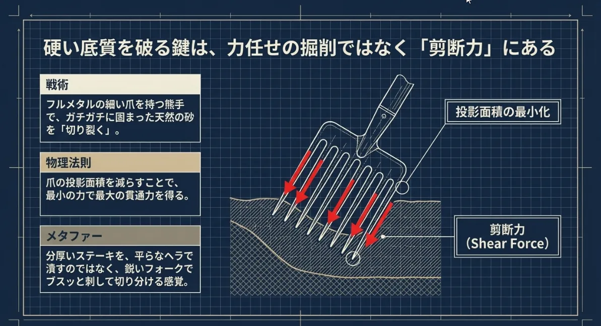 無料エリアの攻略において、最大の壁となるのが「底質の硬さ」です。管理場のようにトラクターで耕されていないため、砂や礫(小石)がガチガチに固まっていることがあります。ここで重要になるのが、力任せに掘ることではなく、物理学に基づいた「剪断力(せんだんりょく)」の活用です。