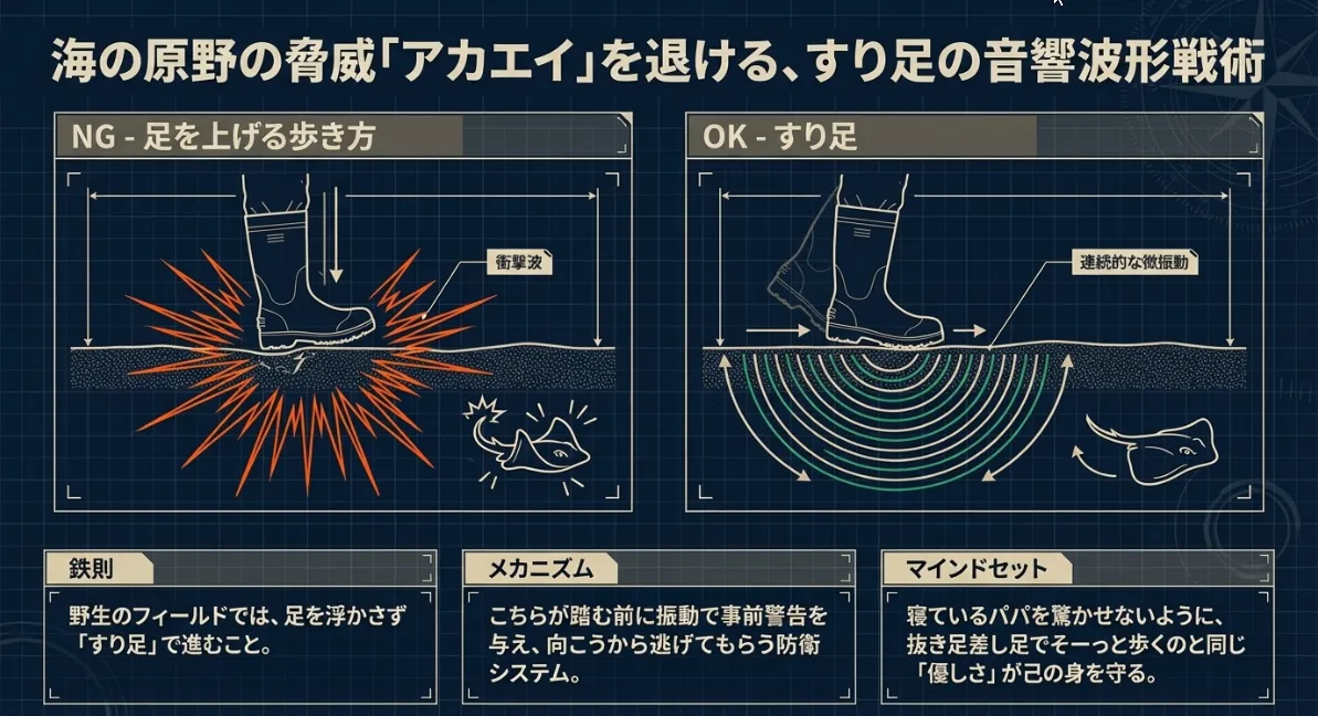 2. 足を浮かさず「すり足」で歩け!アカエイとの接触を防ぐ技術