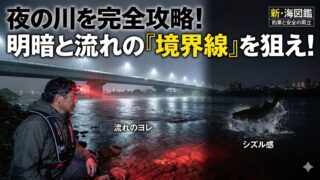 夜釣りの川で釣果を倍増させる秘訣は「物理法則」にあり!明暗の境界線やドリフト釣法の極意など、科学的根拠に基づいたポイント選びとテクニックをヒデが詳しく解説します。安全に楽しむための赤色LEDやライフジャケットの選び方も網羅。この記事で夜釣りの川を攻略するコツを掴んでください。