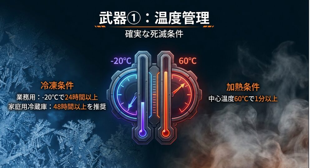 | 冷凍処理 | -20℃で24時間以上 | 家庭用冷凍庫は温度が下がりにくいため、48時間以上を推奨。 |