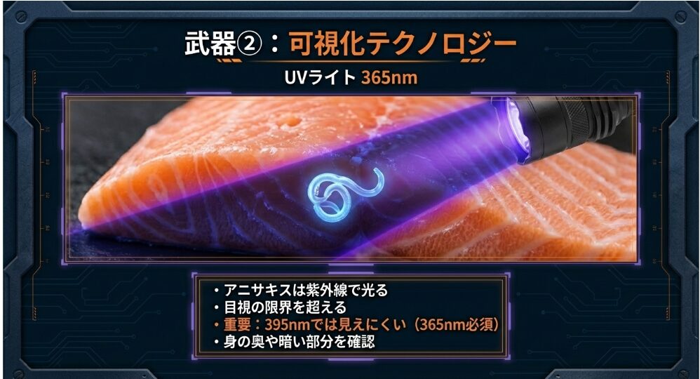 特におすすめしたいのが、アニサキス専用のUVライト(波長365nm)の活用です。 アニサキスの体表は特定の波長の光に反応して青白く蛍光発光する特性があります。 特にチヌのような白身魚は光の透過性が高いため、ライトを当てるだけで筋肉の奥に隠れた虫が浮き上がるように見つかるのです。