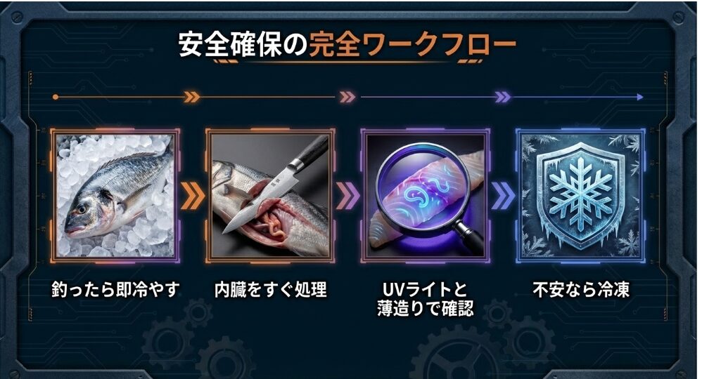つまり、釣った後にそのまま放置したり、内臓を入れたまま数時間持ち歩いたりするのは、自ら食中毒のリスクを高めているようなものなのです。 「釣れた直後の内臓摘出」こそが、家庭に寄生虫を持ち込まないための最強の水際対策であることを覚えておいてくださいね。