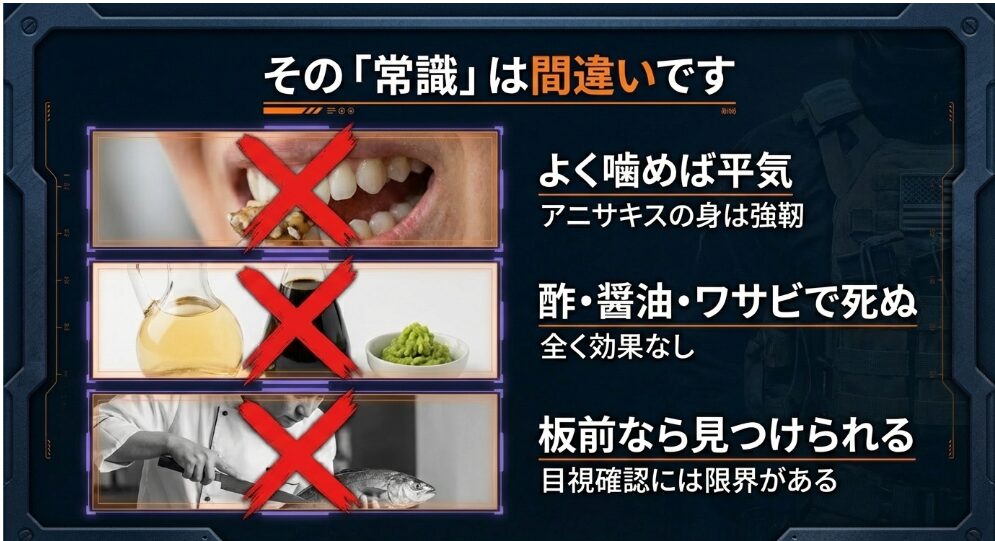 「よく噛めば大丈夫」「酢やワサビで死ぬ」といった話は、残念ながらすべて科学的根拠のない迷信です。 アニサキスの外皮は非常に強靭で、少々の刺激ではびくともしません。
