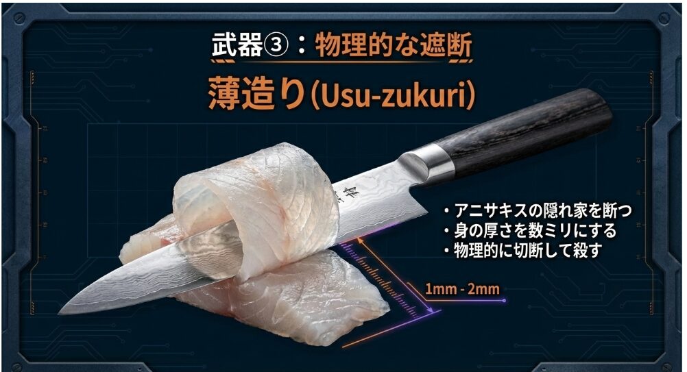 まず、「洗い」を作る際は身を1〜2mmの極薄にスライスしますよね。 この工程そのものが、アニサキスを切断・破壊する確率を高め、さらに断面を増やすことで目視での発見率を劇的に向上させます。