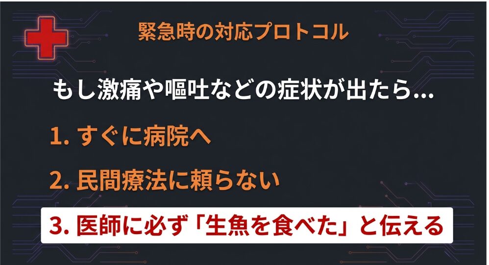 受診の際は、必ず「数時間前に自分で釣った(または購入した)チヌを刺身で食べた」と医師に伝えてください。 この情報があるだけで、診断と処置のスピードが圧倒的に早くなります。