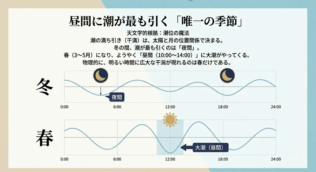 春から初夏にかけては、太陽と月の位置関係によって、日中に潮位が最も低くなる「最大干潮」が訪れます。 逆に冬の間は、この最大干潮が深夜に起きてしまうため、お昼に海へ行っても干潟は十分に現れません。 つまり、私たちが太陽の下で安全に、かつ広大なエリアで貝を探せるのは、この春の時期だけというわけです。