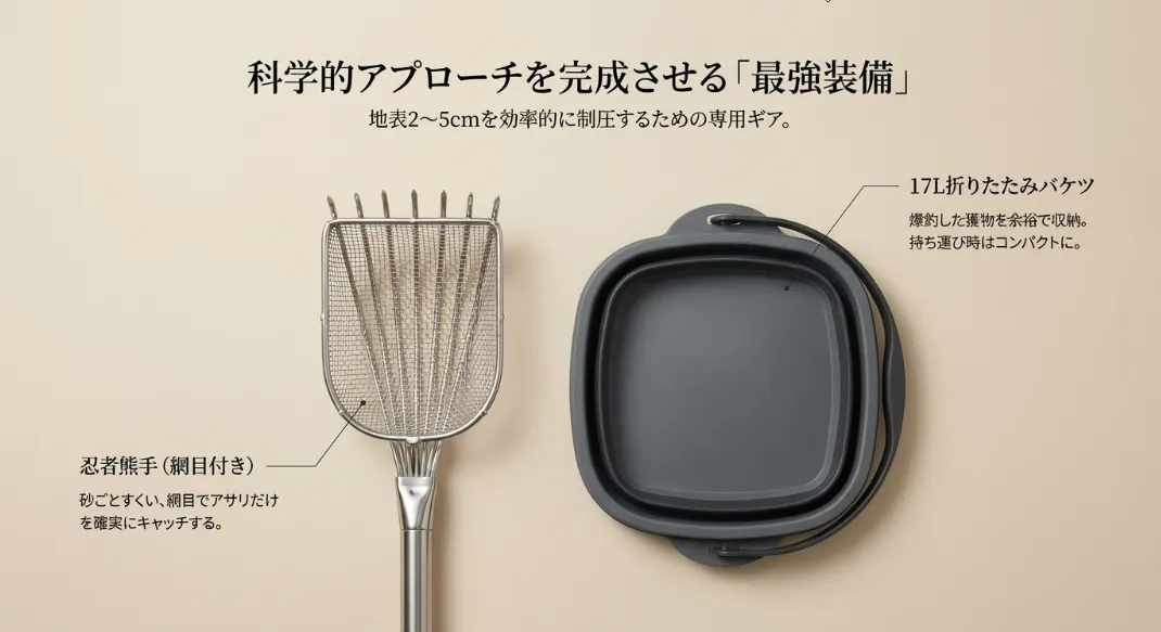 最速で結果を出す!網付き熊手と鮮度を守るバケツの二段構え