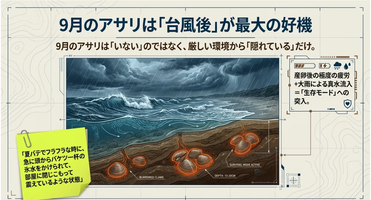 もちろん、春先のような「行けば誰でも獲れる」甘い世界ではありません。台風の接近、秋雨による塩分濃度の低下、そして産卵を終えて疲れ切ったアサリの生理状態……。これらすべての「変数」が複雑に絡み合います。今回は、僕が漂流経験から学んだ海の厳しさと、51歳のパパとして子供に教えたい「9月の攻略法」を、論理的なデータとともに包み隠さずお伝えしますね。
