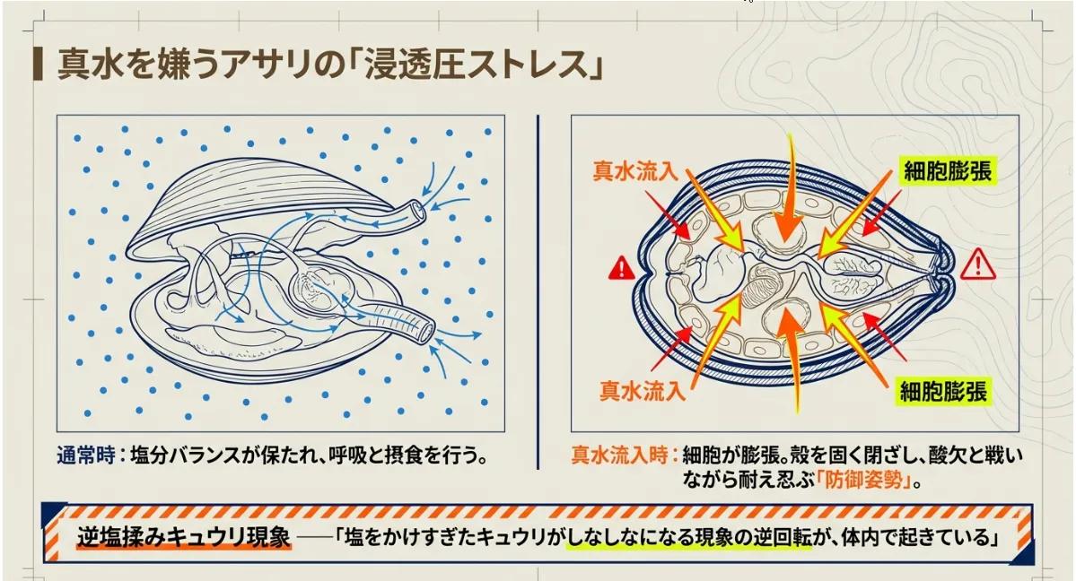 イメージとしては、塩辛い環境に適応した細胞が、急に薄い水にさらされてパンパンに膨らんでしまう「漬物」の逆回転のような状態です。このストレス下では、アサリは1ミリも動く余裕がありません。これが「9月はアサリの穴が見つからない」という物理的現象の正体です。