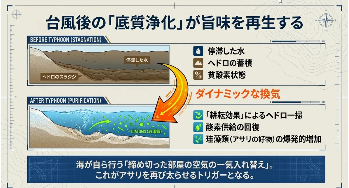 夏の間に溜まった腐敗した海藻(アオサなど)や、ヘドロのような泥。これらは硫化水素を発生させ、アサリの生存を脅かします。台風の荒波はこれらを強制的に沖へ流し、底砂に新鮮な酸素を送り込みます。これを「耕耘(こううん)効果」と呼びます。