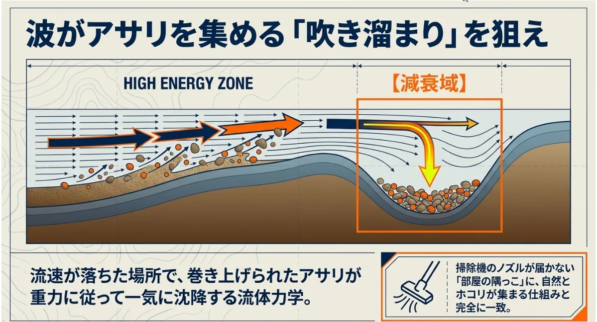 波のエネルギーには法則があります。遮るものがない場所では砂を削り取りますが、障害物にぶつかって勢いが弱まった瞬間、運んでいた砂や貝を一気に落とします。これが流体力学でいう「流速の低下による沈降」です。