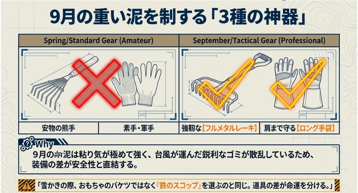 ただし、台風後は泥が深く溜まっていることも多いので、普通の熊手では歯が立ちません。泥を力強く切り裂くフルメタル仕様の道具が、ここでの相棒になります。