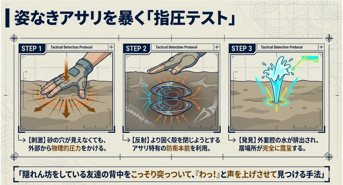 雨の影響で塩分が下がると、アサリは水管を出しません。つまり、春先のような「アサリの目(砂の穴)」が一切見えなくなるんです。ここからは、僕らガチ勢が現場で使っている「目に見えない獲物を探す特殊技能」を紹介しますね。