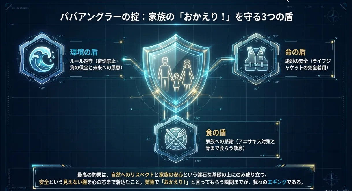 最後に、僕たち海の遊び人が絶対に守るべき「ルールと安全」の話をさせてください。素晴らしい釣果も、安全とルールがあってこそ家族全員の笑顔につながります。