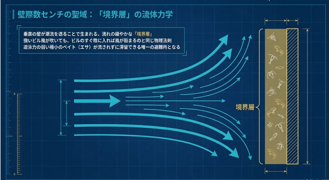 この狭いエリアにエサが集中するのには、物理学的な理由があります。潮流が堤防の壁に当たると、そこには「境界層(こうきょうそう)」と呼ばれる、極めて流速の遅い水の層が生まれます。強い流れに逆らえない小さな生き物たちにとって、この壁際のわずか数センチの空間は、外敵から身を守りつつ食事を楽しめる、まさに「高層マンションの食堂」のような安全地帯になっているわけです。
