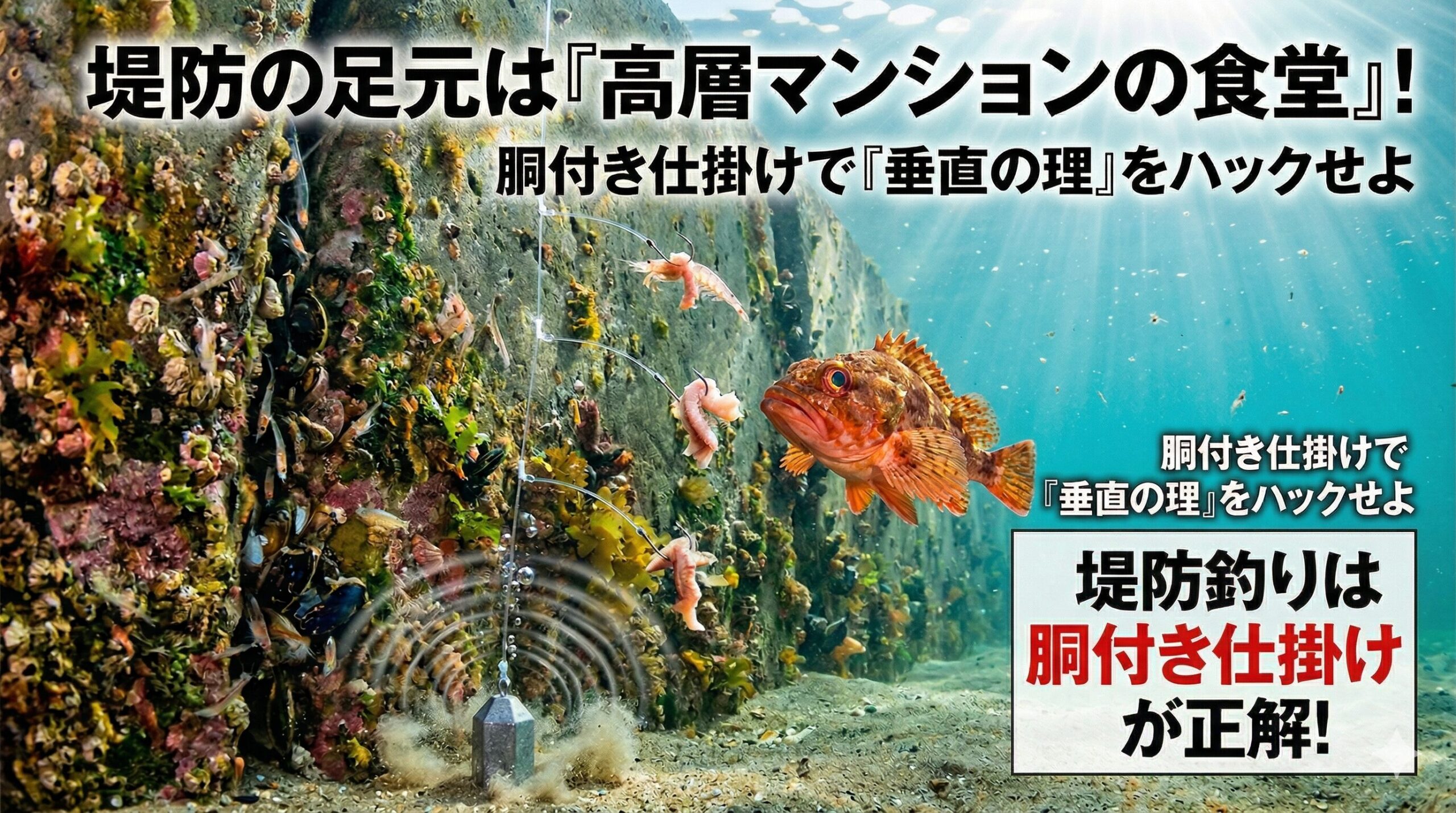 潮が壁にぶつかり、複雑な流れが生まれる場所。そこには小さなエビやカニがひしめき、それを狙う根魚たちが「最高の食事」を待っています。今回は、この垂直な世界を「胴付き仕掛け」という最強の道具でどう攻略するか、僕と一緒に深掘りしていきましょう。