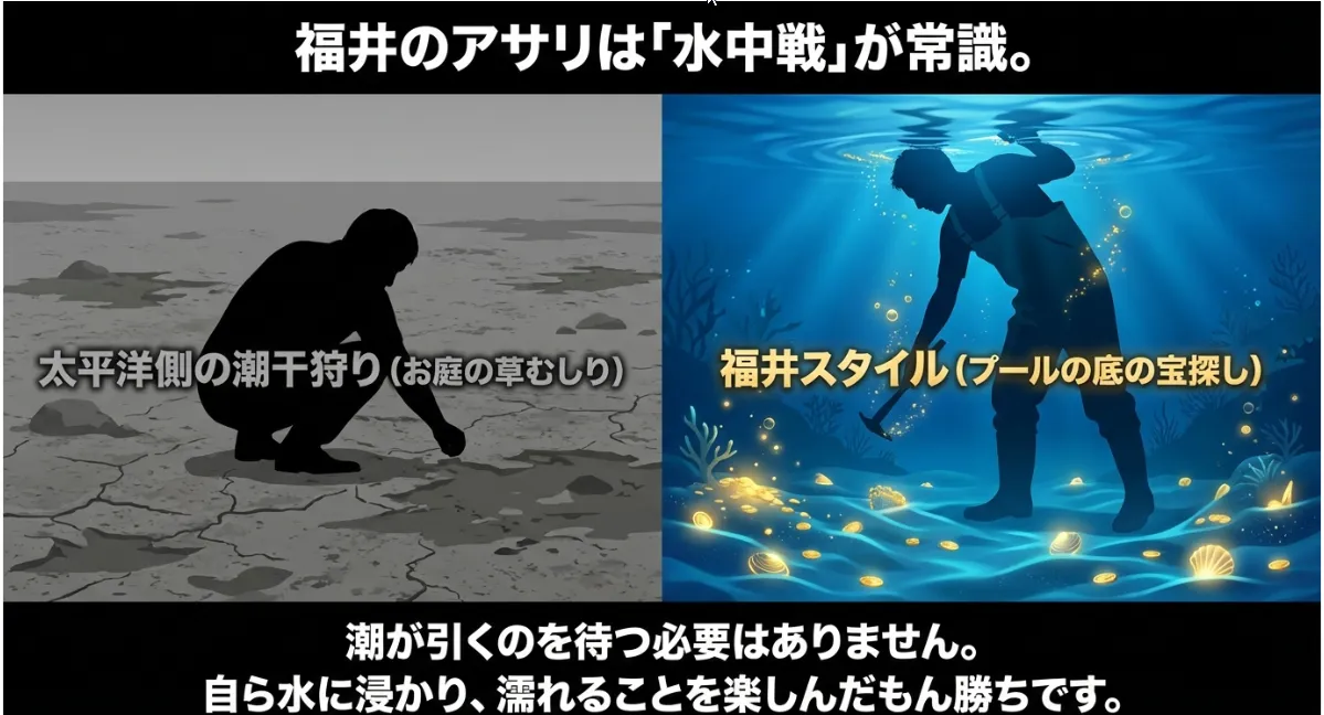 僕も昔、太平洋側の感覚で福井の海に行ったら、いつまで経っても砂浜が出てこなくて驚いたよ。福井では「水に浸かるのが当たり前」という覚悟が大事。でも、その不便さを攻略した先に、九頭竜川が育てた最高のアサリが待っているんだ。この「水中戦」のスリル、たまらないぜ!