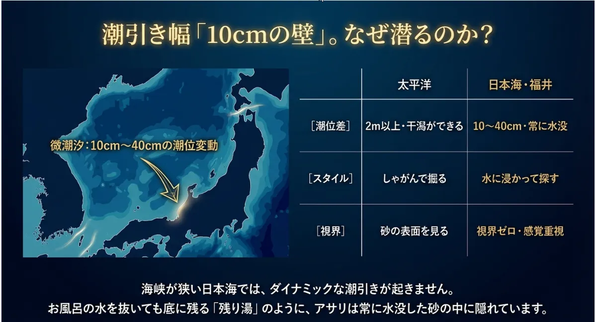 太平洋側の干満差が2メートル以上あるのに対し、福井沿岸の「微潮汐」環境では、最大でも10センチから40センチ程度しか潮が動きません。つまり、アサリがいる場所は「常に水の中」にあると考えたほうがいい。砂が空気に触れる「干出(かんしゅつ)」という時間がほとんどないため、福井のアサリは常に水没した状態で生活しています。これが、福井の潮干狩りが「水中戦」と呼ばれる理由です。