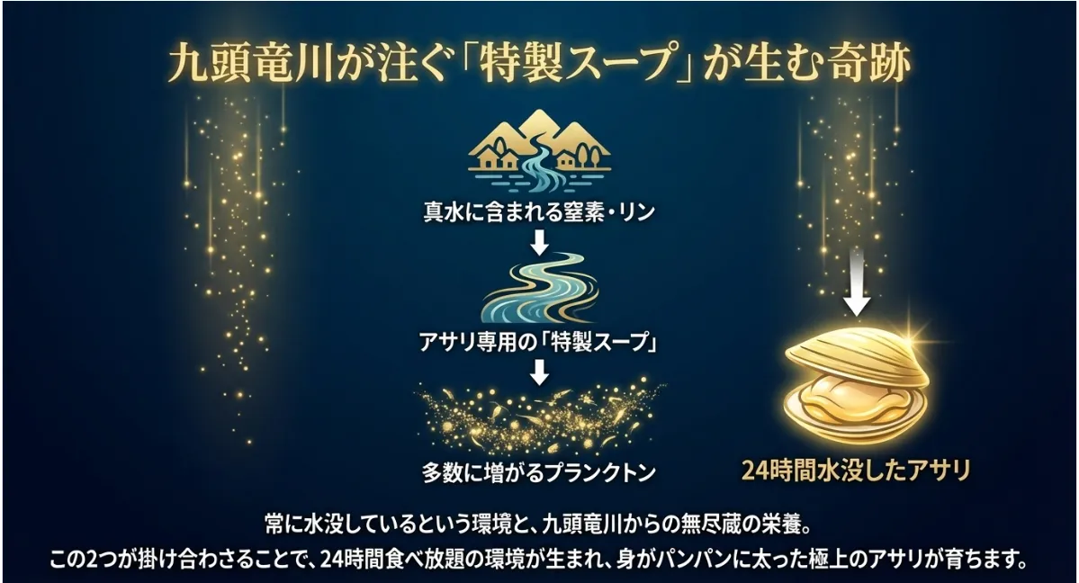 九頭竜川から運ばれてくる窒素やリンといった栄養塩は、河口付近の砂に吸着されます。この栄養を食べて増える「珪藻(けいそう)」という小さなプランクトンがアサリの大好物。潮の流れが穏やかな福井の海では、この栄養が沖に流されず、特定のエリアに濃縮されます。その結果、福井のアサリは栄養たっぷりの環境で、丸々と太ることができるんです。