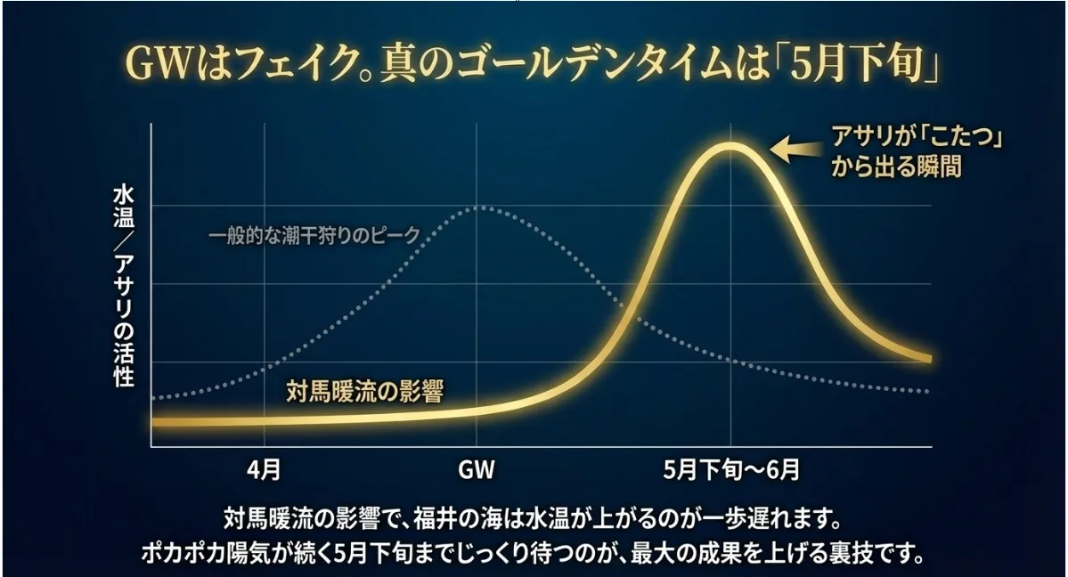 潮干狩りといえば4月のイメージが強いですが、福井の場合は少し事情が違います。キーワードは「水温のラグ(遅れ)」です。