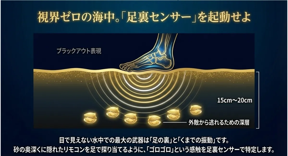 4. 視界ゼロでも獲れる!足裏センサーと振動で貝を特定するプロ技