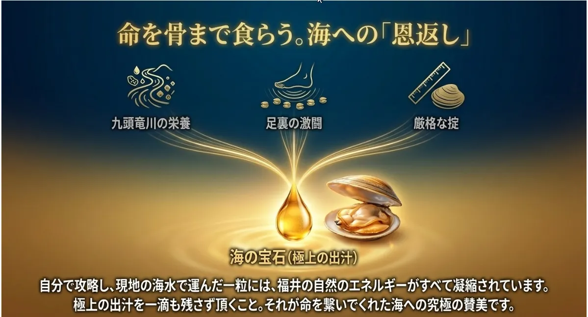 福井の潮干狩りは、単なるレジャーではありません。微潮汐という壁を越え、九頭竜川の恩恵を探し当てる「知的な格闘」です。苦労して獲ったアサリを一口食べれば、対馬暖流が運んだ海の生命力と、福井の自然の豊かさが体中に広がるはず。命に感謝して、一粒残らず、それこそ「骨まで」楽しんでくださいね。