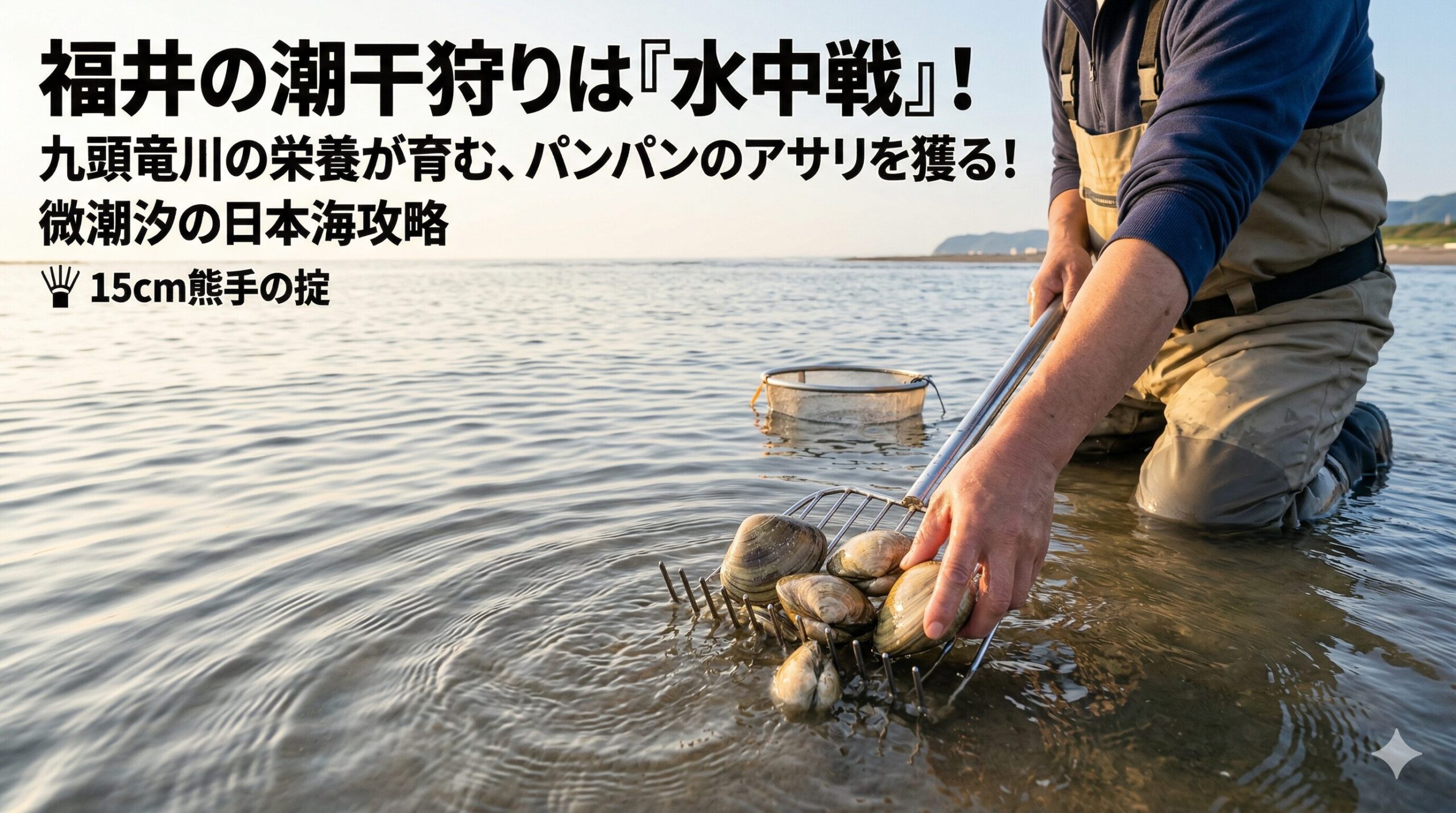日本海は潮位差がわずか数十センチ。砂浜が露出するのを待つのではなく、膝下まで水に浸かりながら深層に潜むアサリを「水中掘削」するのが福井流の勝ち方です。