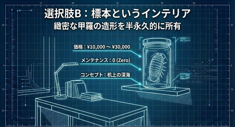 ダイオウグソクムシという神秘的な存在に触れる方法は、決して「飼育」という険しい道だけではありません。プロの技術が詰まった水族館での観察、そして一生モノのインテリアとなる高品質な標本。あなたのライフスタイルに合わせた最適な「深海との距離感」を見つけてみてください。