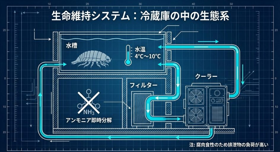 彼らが本来生息しているのは水深数百メートルから千メートルを超える冷たい海底です。水温は常に10度以下. この環境を維持するためには、業務用の冷蔵庫に近い冷却能力を持つコンプレッサー式の水槽用クーラーが不可欠です。多くの飼育者が信頼を寄せる「レイシー」などのハイエンドモデルは、それ単体で10万円近い価格になります。ここに、水圧による負荷に耐えうる厚手のアクリル水槽や、高精度の濾過システムが加わることで、予算は一気に跳ね上がります。趣味の範囲としてはかなり高額ですが、ここをケチることは、彼らにとっての死活問題に直結するんです。