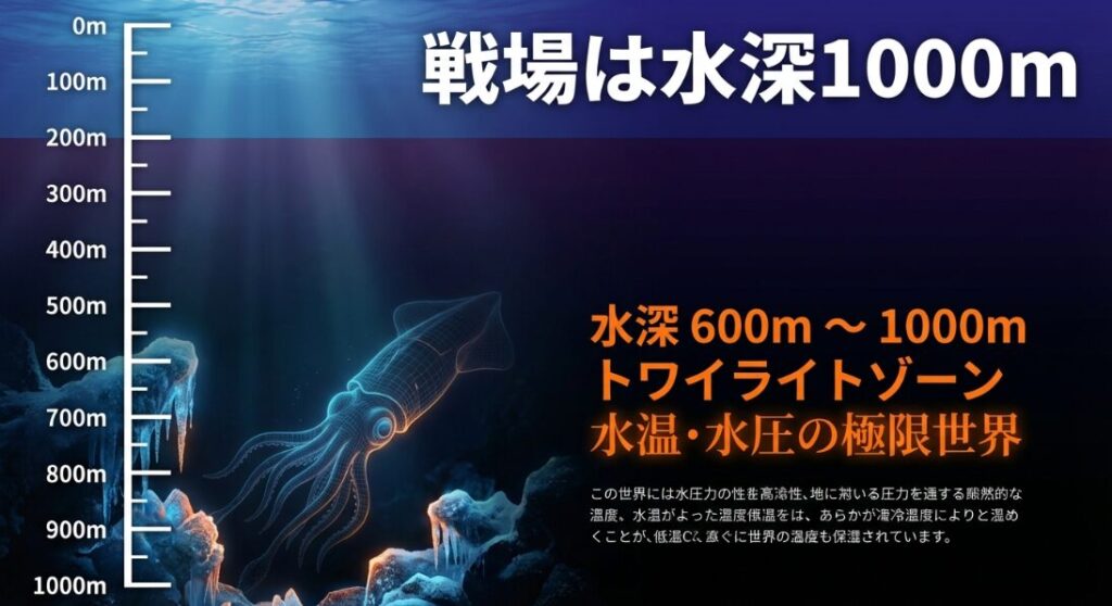 まず決定的に違うのは、ターゲットが存在する「層」です。ゲームでは海面近くや潜める範囲にいますが、現実は水深600メートルから1,000メートルを超える中深層、いわゆる「トワイライトゾーン」が彼らの主戦場。この暗黒の世界では、水温は数度まで下がり、水圧は地上の60倍から100倍にも達します。この環境に生身の人間や一般的な釣り仕掛けが介入すること自体が、物理的にほぼ不可能に近いんです。