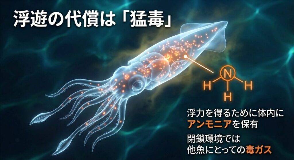 次に、生理学的な観点から飼育の壁となっているのが、ダイオウイカの代名詞とも言える「塩化アンモニウム」による問題です。ダイオウイカは、巨大な体を深海で浮かせるために、筋肉組織に海水よりも比重の軽い塩化アンモニウム溶液を大量に貯め込んでいます。これが、閉鎖的な水槽環境では恐ろしい「毒」へと変わってしまうんです。