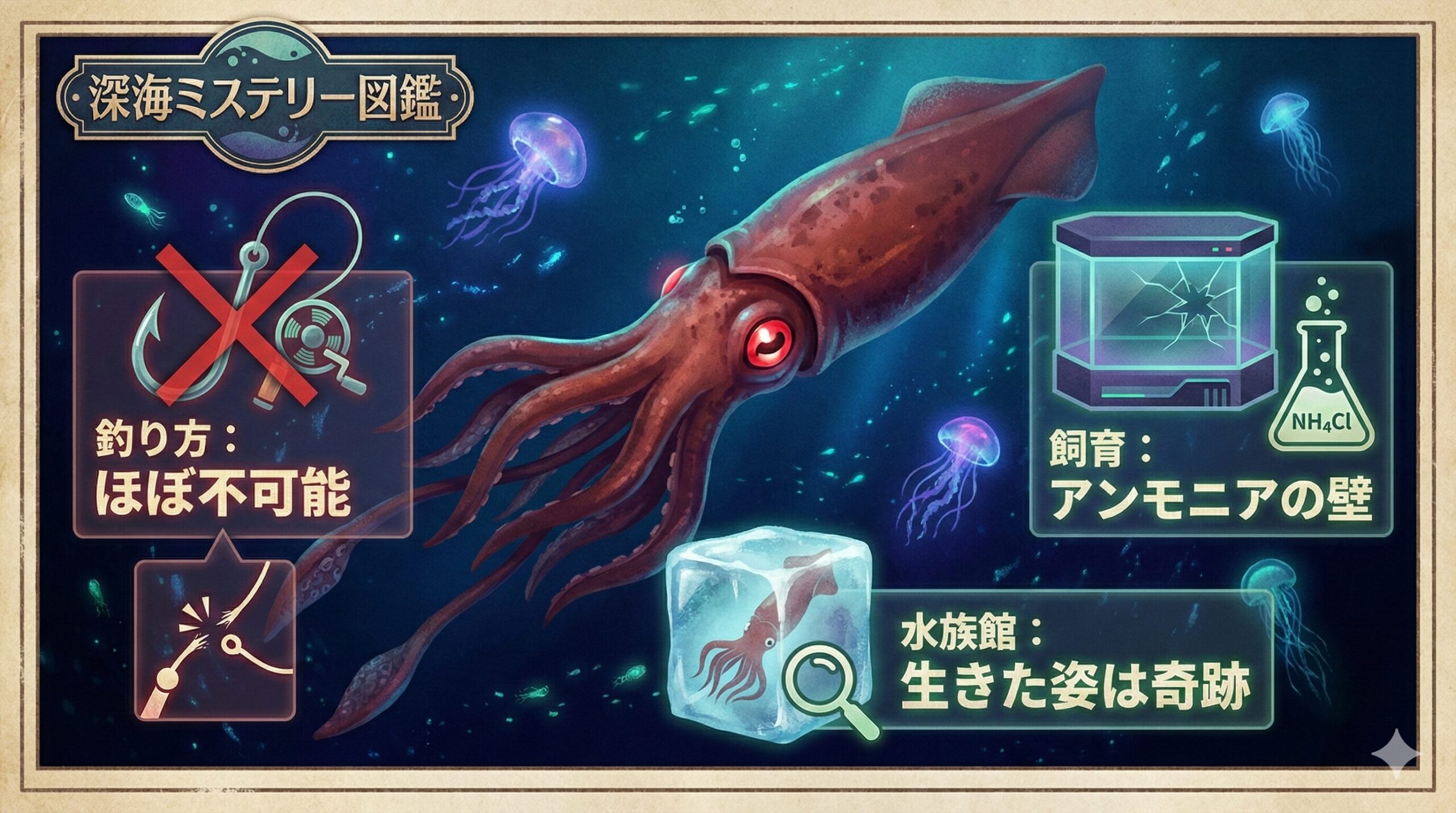 また、これほど有名な生き物なら、どこかの水族館で生きてる姿を展示したり、飼育したりすることはできないのかな?と疑問に思うのも自然なことだと思います。今回は、そんな深海の怪物に関する「釣りと飼育」の真実に迫り、私たちがこのミステリアスな生物とどう向き合えるのかを詳しくお話ししていこうと思います。