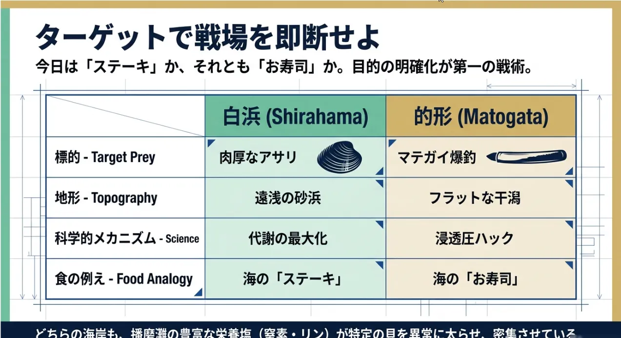 白浜は「肉厚なアサリ」、的形は「爆釣マテガイ」の聖地です。地形の傾斜と砂の性質がそれぞれ特定の貝の成長に特化しているため、狙いを絞るのが大漁への近道ですよ。
