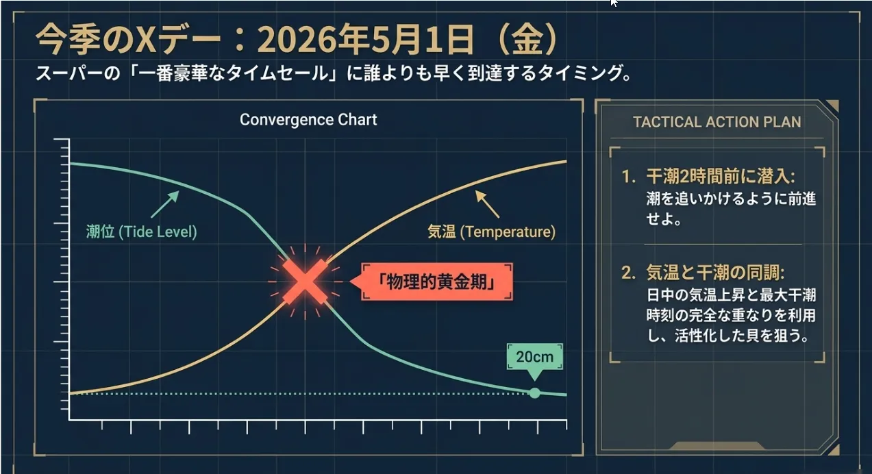 潮干狩りで最も重要な変数は、努力でも運でもなく「天体運動」です。2026年の播磨灘において、最も採取効率が高まるタイミングを特定しました。結論から言うと、2026年5月1日(金)が今シーズン最高の「Xデー」となります。