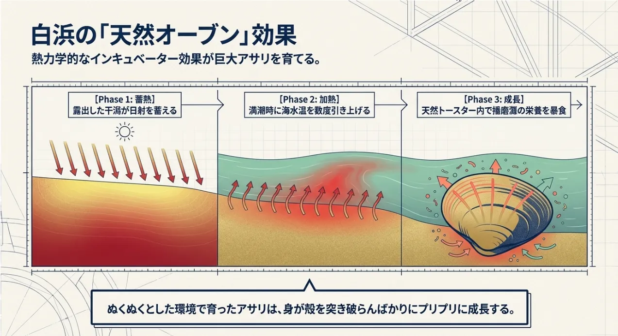 アサリは水温が上がると代謝が活発になり、播磨灘に豊富なプランクトンをガツガツ食べ始めます。この物理的な「天然オーブン」状態が長く続くことで、白浜のアサリは他地域とは比較にならないほど身が分厚く、旨味が凝縮されるわけですね。