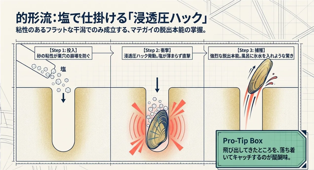 マテガイ採取で塩を使うのは、魔法でも何でもありません。巣穴に食塩(NaCl)を投入することで、穴の中の塩分濃度を急激に上昇させ、マテガイに強烈な「浸透圧ショック」を与える物理的な仕掛けです。マテガイは体内の塩分バランスを守るため、異常に濃くなった環境から逃げようと、本能的に地上へ垂直移動します。これが、砂から飛び出す現象の正体です。