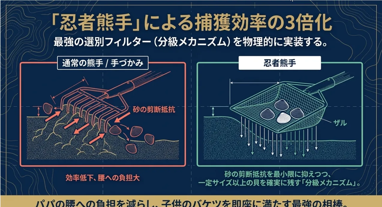 砂だけを逃して貝を残す「忍者熊手」の工学的メリット
