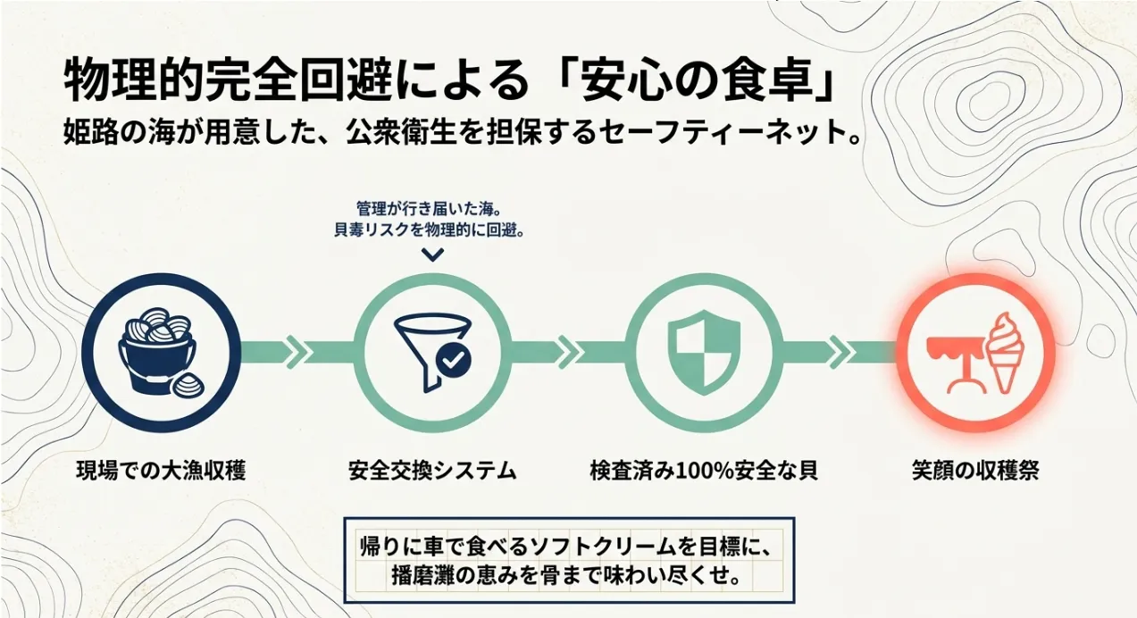 瀬戸内海のような閉鎖性海域では、春先の水温上昇に伴い、プランクトンの変化で「貝毒」が発生することがあります。しかし、姫路の管理潮干狩り場では、このリスクを物理的に遮断するシステムが整っています。もし検査で規制値を超えた場合、自分たちが掘った貝を回収する代わりに、あらかじめ浄化・検査済みの安全な貝を渡してくれる仕組みです。これにより、僕たちは食中毒の心配をすることなく、掘る楽しさだけを満喫できるわけですね。