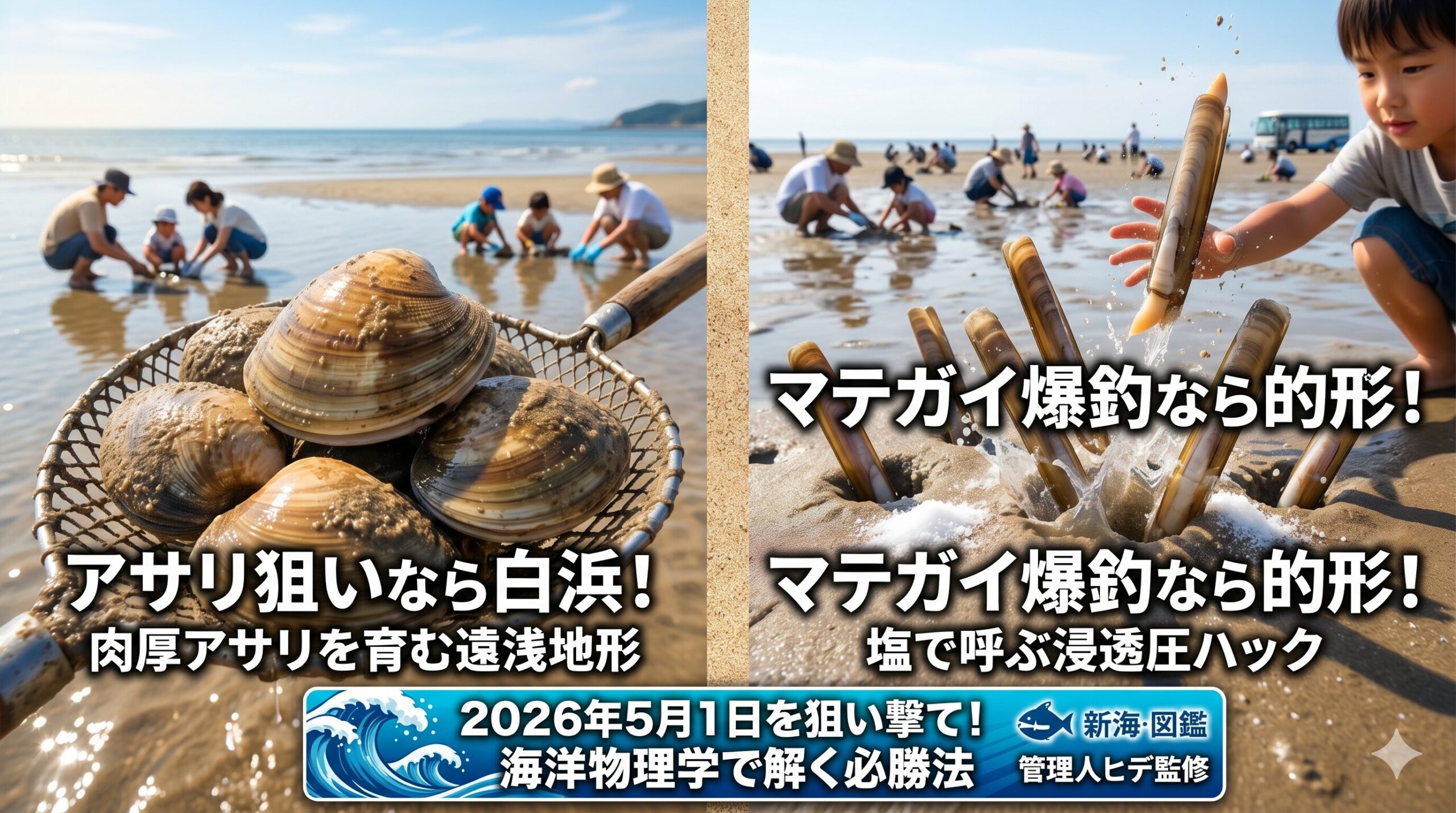 特に5月1日は、日中の気温上昇と干潮時間が完璧に一致します。これは、白浜の「遠浅地形」が太陽熱を吸収し、アサリの代謝が最大化される時間帯とも重なるため、貝の活性が高く視認性も向上するんです。
