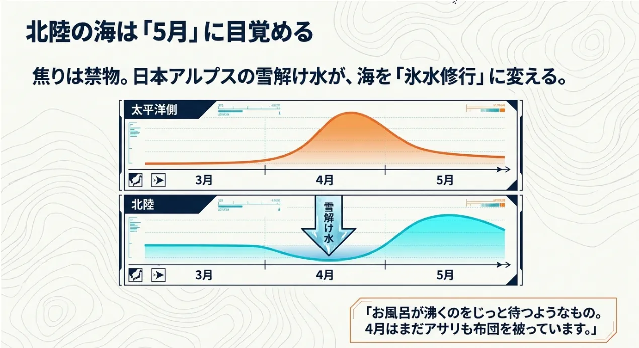 北陸の海が太平洋側より1ヶ月遅れる最大の理由は、立山連峰や白山連峰から流れ込む膨大な「雪解け水」にあります。3月から5月にかけて、川から冷たくて軽い真水が海へ一気に流れ込みます。