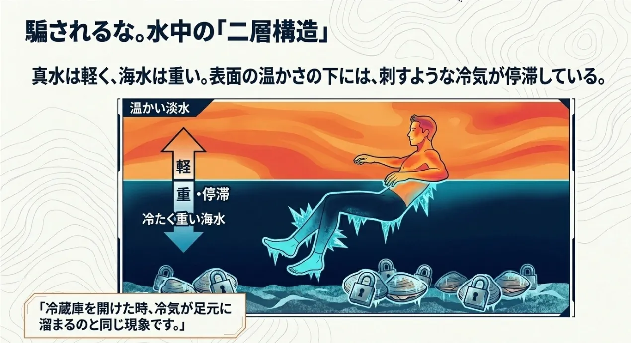 実は、海に入ると「不思議な感覚」に襲われます。手で触れる水面は温かいのに、足先は刺すように冷たいんです。これは、塩分の薄い雪解け水が「軽い」ため海水の表面を覆い、温かい海水と混ざらずに層を作ってしまう「密度成層」という現象。まるでお風呂の上の方だけが熱くて、底が冷え切っている状態と同じですね。