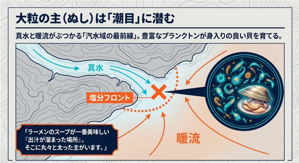 アサリやハマグリが最も好むのは、実は真水と海水が混ざり合う「汽水域」です。北陸では河口から冷たい雪解け水が供給され、それが対馬暖流とぶつかり合う場所に「塩分フロント(潮目)」が形成されます。この境界付近にはプランクトンが豊富に蓄積されるため、貝たちの生育も抜群。河口から少し離れた、真水の気配がわずかに残る砂地を集中的に狙うのが、北陸で大漁を掴む最大の秘策です。